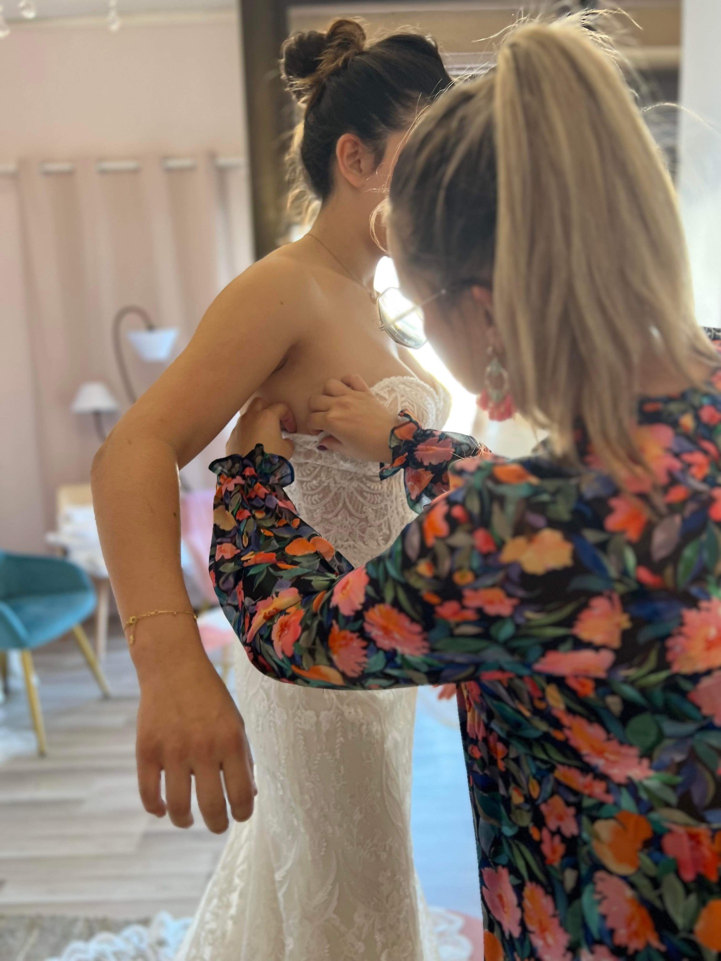Chez Magic Day, nous croyons que chaque détail compte. C'est pourquoi nous privatisons un salon d'essayage pour nos visiteurs, offrons de délicieuses gourmandises et de réconfortantes tasses de thé, et nous avons toujours des mouchoirs à portée de main. Parce que nous comprenons que ce moment est souvent chargé d'émotions pour les accompagnants et les futures mariées.